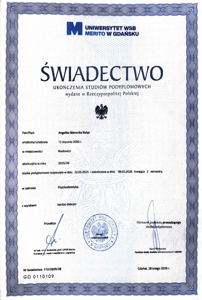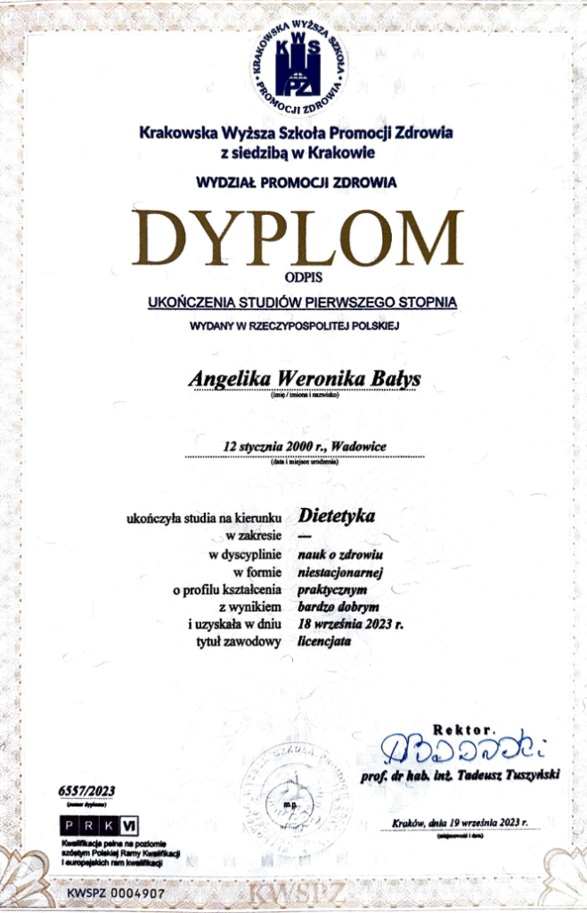 Ada AdryańczykTrustindex sprawdza, czy pierwotnym źródłem recenzji jest Google. Zanim jeszcze oficjalnie rozpoczęłyśmy współpracę, Angelika powiedziała mi więcej o hormonach i czego potrzebuje moje ciało, niż kilku endokrynologów i ginekologów przez kilka lat leczenia. Po 2 miesiącach trzymania się zaleceń pierwszy raz od dawna mogłam normalnie funkcjonować podczas miesiączki. Dzięki suplementom i diecie czuję się o wiele lepiej, nauczyłam się jeść regularnie, aby zadbać o poziom kortyzolu, a holistyczne podejście i zachęcanie do kompleksowego zadbania o siebie ma dodatkowe pozytywne skutki uboczne w postaci lepszego snu i większej ilości energii. Myślę, że nie skłamię mówiąc, że zainwestowanie we współpracę było najlepszą inwestycja w zdrowie jakiej mogłam dokonać w bardzo trudnej sytuacji z kilkoma zaburzeniami hormonalnymi. Otworzyło oczy na to, że da się bez presji o siebie zadbać, i już nigdy nie chciałabym wrócić do wcześniejszych nawyków żywieniowych. Polecam każdej kobiecie, bo zasługujemy na to, żeby nasze ciało czuło się dobrze <3Opublikowano na Karolina IndykTrustindex sprawdza, czy pierwotnym źródłem recenzji jest Google. Pani Angelika dokładnie i zrozumiale wyjaśniła mi moje wyniki podczas prywatnej konsultacji. Godzina upłynęła w bardzo miłej atmosferze, a ja wiem już, nad czym powinnam popracować i jak lepiej zadbać o swoje zdrowie, za co jestem ogromnie wdzięczna. Trafiłam na Panią zupełnie przypadkiem i bardzo się z tego cieszę – widać, że kocha Pani to, co robi, i tak właśnie powinno być. Dziękuję za pomoc i życzę wielu dalszych sukcesów w życiu prywatnym i zawodowym.Opublikowano na NataliaTrustindex sprawdza, czy pierwotnym źródłem recenzji jest Google. Współpraca z Angeliką przebiegała bardzo na luzie, ale to nie znaczy że nie ma efektów. Wybrałam opcje miesięczną i już ona wpłynęła na moje nawyki w związku z przygotowywaniem posiłków. Cieszę się że nie było restrykcyjnie, mogłam wybierać posiłki na jakie mam ochotę, dużo też wskazówek zdrowotnych. Bardzo polecam! 🫶Opublikowano na Anna KwiatkowskaTrustindex sprawdza, czy pierwotnym źródłem recenzji jest Google. Pracowałam z panią Angeliką przez 3 miesiące i udało się zrzucić prawie 14 kilogramów, gdzie wcześniej kompletnie nie mogłam sobie poradzić ☹️ Dieta przepyszna, dopasowana pode mnie - codzienny kontakt, nawet gdy zapomnę dać znać po tygodniu co i jak! Pani Angelika bardzo zaangażowana w moją przemianę, aplikacja bardzo ładna, posiłki smaczne. Polecam każdemu, najlepszy dietetyk! 🫶🏻🥰Opublikowano na Oliwia ChrzanTrustindex sprawdza, czy pierwotnym źródłem recenzji jest Google. Współpracowałam z Angeliką przez miesiąc i jestem bardzo zadowolona. Jest miłą osobą, która odpowie na każde nurtujące pytanie. Dokładnie przeanalizowała moje wyniki badań i dobrała do nich suplementację oraz dietę. Posiłki z diety były pyszne. Zostaje ze mną duża dawka nowej wiedzy i lepsze nawyki żywieniowe (zdecydowanie więcej warzyw!). Serdecznie polecam! 😊Opublikowano na Małgorzata StojanowskaTrustindex sprawdza, czy pierwotnym źródłem recenzji jest Google. Chciałabym bym się podzielić wrażeniami podczas czasu, w którym postanowiłam zadbać o moje kilogramy ciała. Szukając pomocy, wsparcia podczas mojej drogi do zrzucenia ,,kilku" kilogramów natrafiłam na Angelike. Bardzo dobrze mi się współpraca z dietetyczką układała jak również bardzo jestem wdzięczna za to co mi zostało zaoferowane podczas tej drogi w zgubieniu tego co zgubić pragnie każda kobieta😉. Dostałam wsparcie z przepisami, duży wybór możliwości dopasowania pode mnie potraw, jak również internetowy kontakt w razie potrzeby jeszcze bardziej wymyślnej zmiany pod moje kubki smakowe 😉 a jednak lekkich i sycących smaków. Kierując się wskazówkami Angeliki i wytrwałością, niechciane kilogramy zaczęły schodzić w dół ku mojej radości, a 😁co bardziej ładowało mnie pozytywnością i chęcią do działania jeszcze bardziej . Na chwilę obecną nabrałam na tyle nawyków żywieniowych ze mogę sobie juz sama świetnie dawać radę .Polecam wszystkim AngelikeOpublikowano na Julia KoikTrustindex sprawdza, czy pierwotnym źródłem recenzji jest Google. Szczerze polecam. Przez cały miesiąc czułam się zaopiekowana. Angelika jest przesympatyczna i zawsze stara się pomóc. Jedzenie szybkie w przygotowaniu, smaczne i co ważne syci na długo. Polecam! ☺️Opublikowano na NataliaTrustindex sprawdza, czy pierwotnym źródłem recenzji jest Google. Jestem bardzo zadowolona z współpracy! Angelika jest bardzo miła, konkretna, zawsze znajduje czas by odpowiedzieć na każde moje pytanie, wyczerpująco odpowiada na pytania.Kontakt jest bardzo łatwy. Odpowiada bardzo szybko. Do każdego podchodzi z sercem ❤️ Pomaga na każdym kroku. Motywuje do pracy nad sobą. Polecam !Opublikowano na Paulina SzkodzińskaTrustindex sprawdza, czy pierwotnym źródłem recenzji jest Google. Prawie przez rok walczyłam ze swoimi dolegliwościami (złe samopoczucie, średnie wyniki badań) aż to momentu kiedy zgłosiłam się do Angeliki. Po zapoznaniu się ze wszystkim dostałam odpowiednią dietę i suplementację i już po tygodniu było widać efekty. Teraz minął miesiąc a ja czuję się jak zupełnie nowa osoba. To wszystko dzięki Angelice. To naprawdę cudowna osoba z ogromną wiedzą i zaangażowaniem w to co robi. Posiłki są proste a przy tym smaczne, tak naprawdę nie czułam, że mam jakąś dietę a z dnia na dzień było coraz lepiej. Otrzymywałam odpowiedź na wszystko, czułam się naprawdę zaopiekowana i wysłuchana. Polecam Angelikę z całego serca, to odpowiednia osoba na odpowiednim miejscu 🥰Opublikowano na Gabriela KurdzielTrustindex sprawdza, czy pierwotnym źródłem recenzji jest Google. Współpraca z Angeliką dietetykie